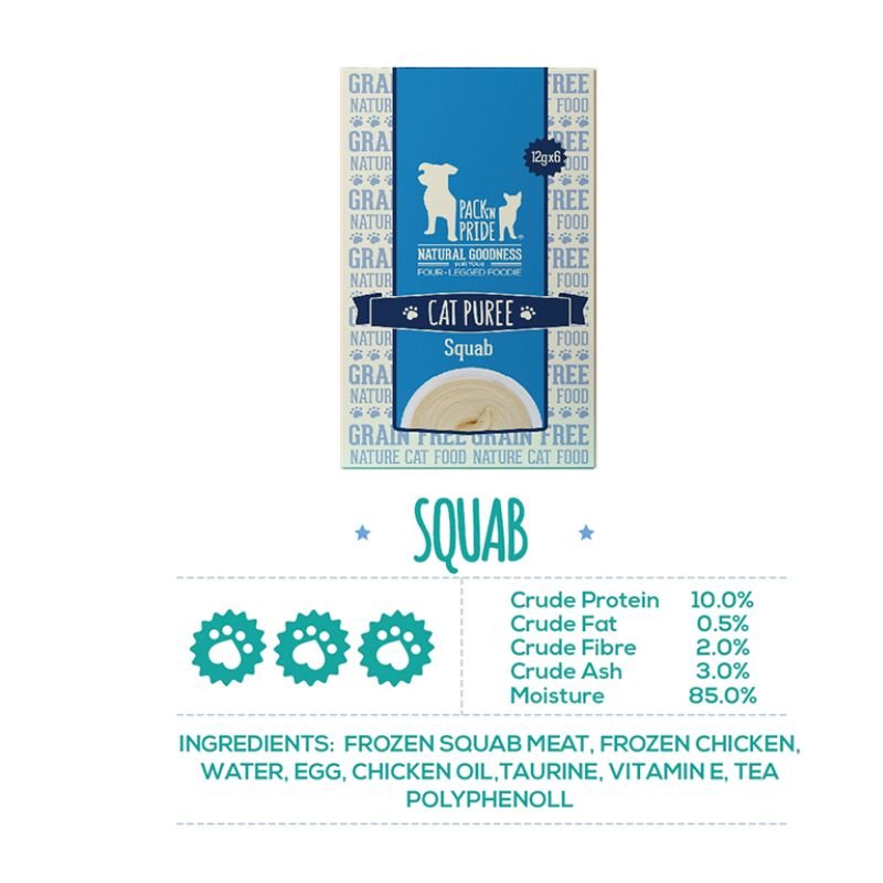 Product Name:Cat Strip Squab Mashed Wet Grain Weight/Unit:72g Ingredients:Squab 32%, Chicken 31%, Water, Sunflower Oil, Tapioca Starch, Xanthan Gum, Taurine, Vitamin E, Tea Polyphenols Guaranteed Analysis: Crude Protein 8.6% Crude Fat 1.5% Crude Ash 2.2% Crude Fiber 0.4% Moisture 85% Shelf Life:24 Months Usage: Cat Unit/Carton:24